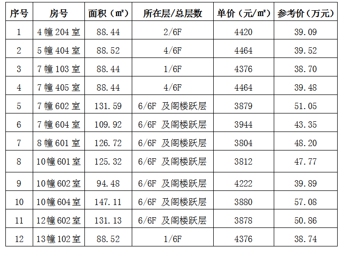 一、拍賣標(biāo)的:裕安區(qū)城南鎮(zhèn)振華藍(lán)泊灣12套住宅用房,單價(jià)3804元/㎡-4460元/㎡不等,具體見下表: