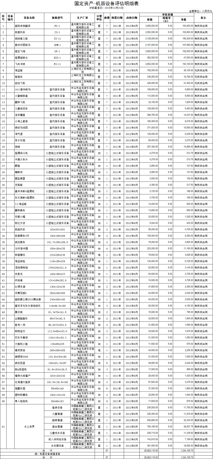一、拍賣標(biāo)的:金領(lǐng)歡樂世界廢舊設(shè)施設(shè)備一批,包括:1、游樂場廢舊設(shè)備一批,參考價133.41萬元。該批設(shè)備已停運三年以上,按現(xiàn)狀拍賣;2、空調(diào)等制冷設(shè)備,參考價21.47萬元;3、一般桌椅、貴重桌椅、辦公用品、廚具用品,參考價4.58萬元。標(biāo)的詳情見所附清單。