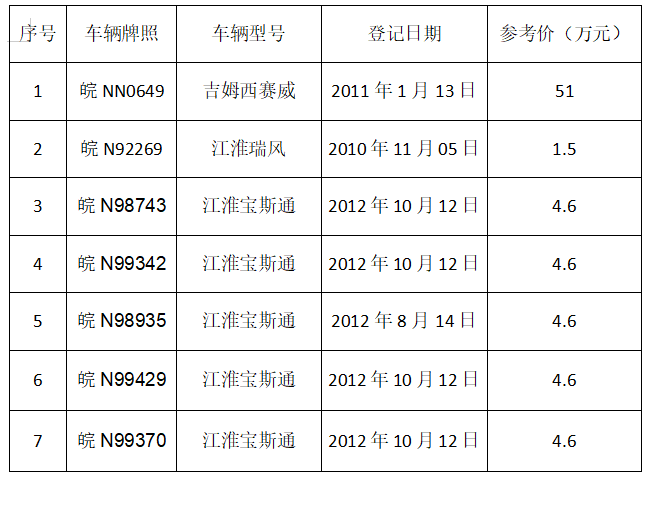 三、注意事項:有意競買者請交納保證金:標(biāo)的1保證金為5萬元;標(biāo)的2至標(biāo)的7保證金為每輛車1萬元,至賬戶:安徽邦德拍賣有限公司,開戶銀行:中國工商銀行股份有限公司六安南門支行,賬號:1314202409300068442。并于拍賣會前在網(wǎng)上完成報名手續(xù)。報名詳詢13956133366。競買不成,保證金5個工作日內(nèi)無息退還。