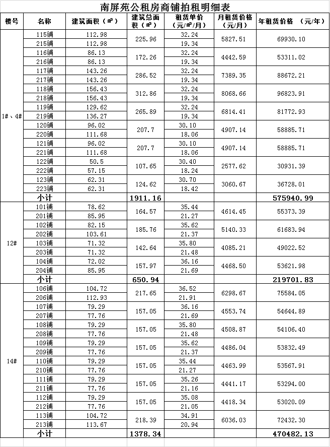 1、南屏苑公租房1#、4#樓商鋪5年租賃經(jīng)營權(quán),9上9下計18間,總建筑面積約1911.16㎡,整體拍租,參考價57.6萬元/年,競租保證金12萬元;