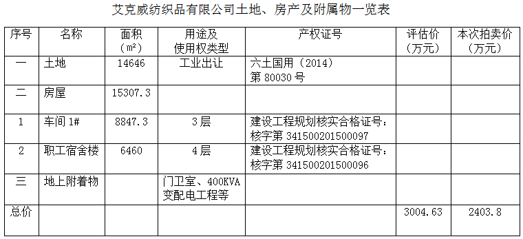一、拍賣標(biāo)的:位于六安市金安經(jīng)濟(jì)開發(fā)區(qū)鳳凰路與山源路交匯處六安艾克威紡織品有限公司所擁有的房產(chǎn)(約15307.3㎡)、工業(yè)土地(約14646㎡)、附屬物等。包括:
