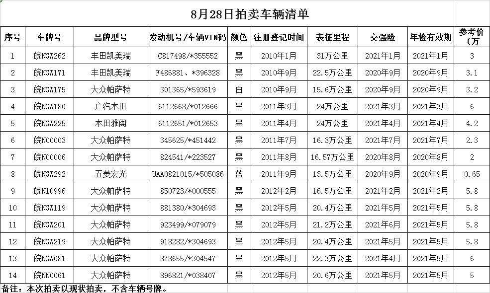 14輛公務(wù)用車(車牌號為本次拍賣車輛的依據(jù),拍賣不含車輛號牌,詳見拍賣清單),參考價:0.65-6萬元/輛。違章由車輛原單位處理,車輛以交付時的實際情況為準(zhǔn),車輛圖片請查看公司微信號:安徽邦德拍賣