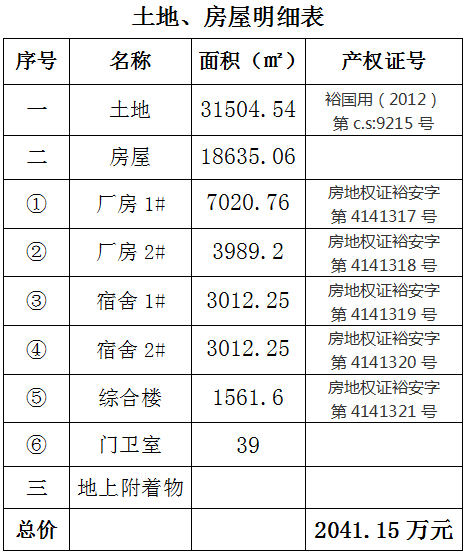 一、拍賣(mài)標(biāo)的:位于六安市城南鎮(zhèn)高新技術(shù)產(chǎn)業(yè)開(kāi)發(fā)區(qū)(原裕安經(jīng)濟(jì)開(kāi)發(fā)區(qū))振東大道,安徽華濤電子有限公司破產(chǎn)財(cái)產(chǎn),包括:工業(yè)用地31504.54㎡,約47.3畝,土地證號(hào):裕國(guó)用(2012)第c.s:9215號(hào);廠房、辦公樓、宿舍樓等房產(chǎn),總建筑面積約18635.06㎡,其中:1# 廠房建面7020.76㎡;2#廠房建面3989.2㎡;1#宿舍建面3012.25㎡;2#宿舍建面3012.25㎡;綜合樓建面1561.6㎡;門(mén)衛(wèi)室建面39㎡。以上標(biāo)的以及地上附著物整體拍賣(mài),參考價(jià)2041.15萬(wàn)元。