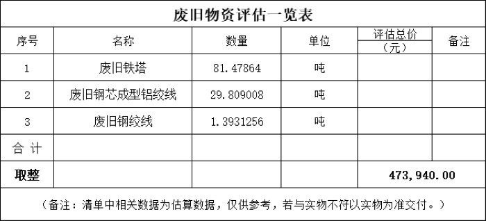 一、拍賣標(biāo)的:廢舊鋼芯成型鋁絞線、廢舊鐵塔、廢舊鋼絞線等廢舊物資一批。參考價47.394萬元。