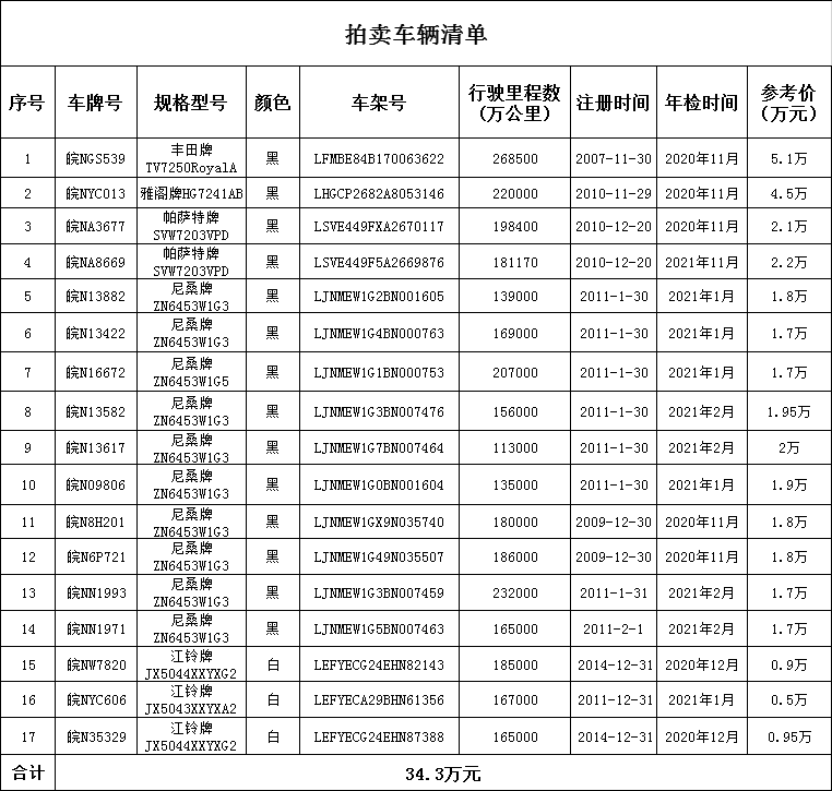 一、 拍賣標的:豐田皇冠、本田雅閣等二手車17輛,打包拍賣,參考價34.3萬元。車輛詳情見下方清單: