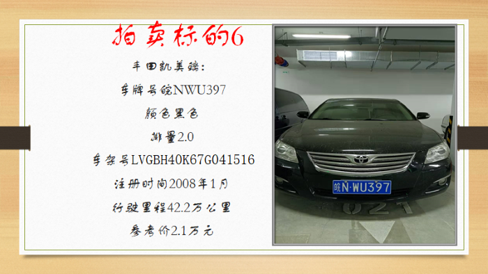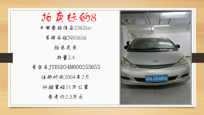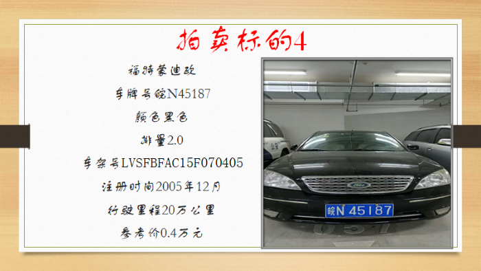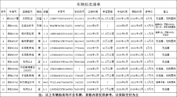 一、拍賣標(biāo)的:二手車11輛(車牌號(hào)為本次拍賣車輛的依據(jù),拍賣不含車輛號(hào)牌,詳見拍賣清單)。車輛以交付時(shí)的實(shí)際情況為準(zhǔn),參考價(jià):0.4萬(wàn)元-6萬(wàn)元/輛。
