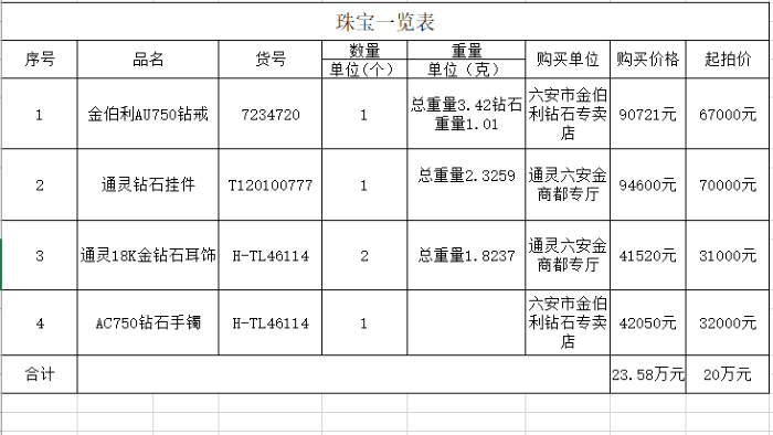 一、拍賣標(biāo)的:金伯利AU750鉆戒一個、通靈鉆石掛件一個、通靈18K金鉆石耳飾兩個(一對),AC750鉆石手鐲一個。詳情見下表。