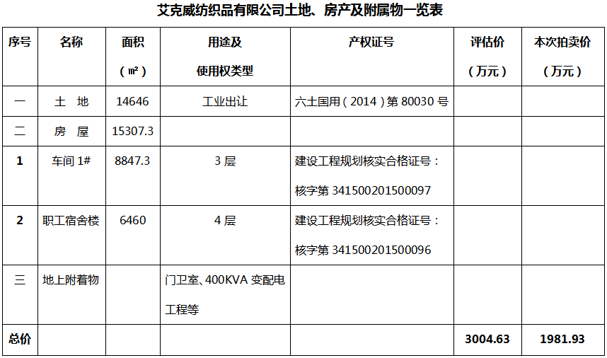 一、拍賣標(biāo)的:位于六安市金安經(jīng)濟(jì)開發(fā)區(qū)鳳凰路與山源路交匯處六安艾克威紡織品有限公司所擁有的房產(chǎn)(約15307.3㎡)、工業(yè)土地(約14646㎡)、附屬物等,整體拍賣,參考價(jià)1981.93萬元。包括: