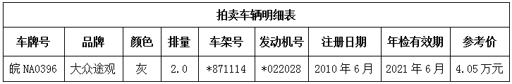 一、拍賣標的:皖NA0396大眾途觀,注冊日期2010年6月,2.0排量,年檢有效期至2021年6月,參考價4.05萬元。