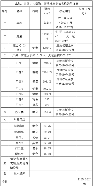 一、拍賣標(biāo)的:六安市金安區(qū)三十鋪工業(yè)園區(qū)、鳳凰路與勝利路交叉口向北100米,門朝西,六安大軍皮革制品有限公司所擁有的工業(yè)房地產(chǎn)、附屬用房及附屬物等,整體拍賣,參考價(jià)1135.32萬元。包括:工業(yè)土地21248㎡,約32畝,有工業(yè)出讓土地證;鋼構(gòu)廠房8315.69㎡,辦公樓616.6㎡,綜合樓1370㎡,以上房產(chǎn)均有房產(chǎn)證,有證房產(chǎn)合計(jì)約10302.99㎡。另有無證房產(chǎn)1637.37㎡。房產(chǎn)面積合計(jì)約11940.36㎡。