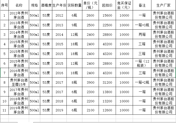 1、貴州茅臺(tái)酒119瓶,具體詳見下方清單: