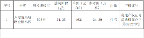 標(biāo)的1:六安市皋城路與梅山北路交叉口煙草巷金雁小區(qū)503室住宅房,建筑面積74.25㎡,4631元/㎡,起拍價:34.39萬元。