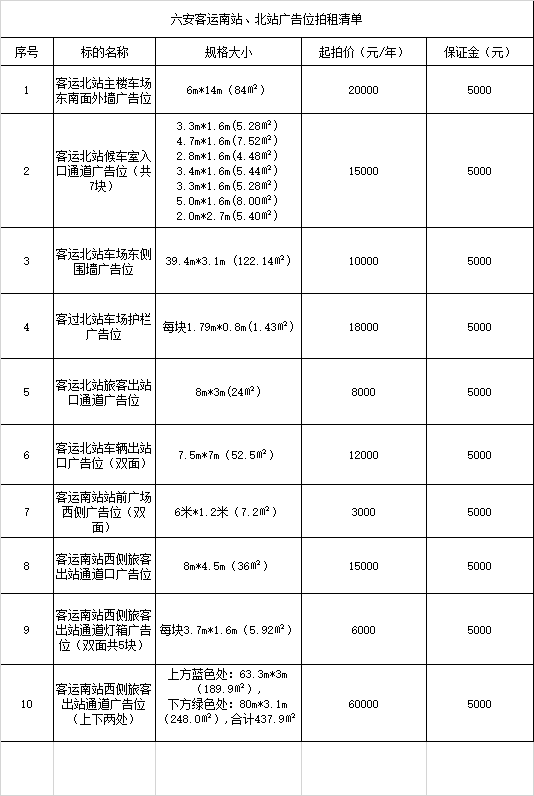 1、六安客運南站、北站進出口處廣告位10處拍租,具體見下方清單(可放大查看):