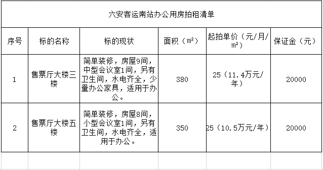 六安客運南站售票廳大樓三樓、五樓房屋,簡單裝修,其中三樓房屋9間,中型會議室1間,另有衛(wèi)生間。水電齊全,少量辦公家具,適用于辦公、茶樓、賓館等;五樓房屋8間,小型會議室1間,另有衛(wèi)生間。水電齊全,適用于辦公、茶樓、賓館等。具體見下方清單: