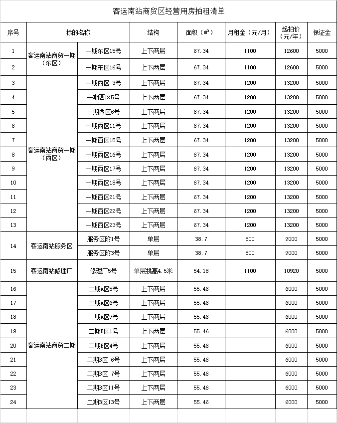 六安客運南站站內(nèi)門面共計24間,具體見下表: