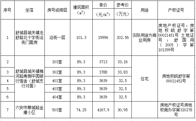 標(biāo)的2-6:舒城縣城關(guān)鎮(zhèn)梅河路南側(cè)小區(qū)(中行宿舍)五套住宅房,參考價(jià)約32.5萬(wàn)元/套,保證金3萬(wàn)元。