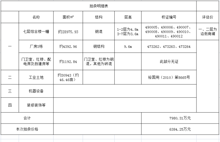 位于六安市裕安區(qū)城南鎮(zhèn)、沿105國(guó)道、省級(jí)高新區(qū)六安高新技術(shù)產(chǎn)業(yè)開發(fā)區(qū),六安市鴻源機(jī)械有限責(zé)任公司所擁有的房屋建筑物及附屬、土地、機(jī)器設(shè)備、裝飾裝修等,包括:1、沿105國(guó)道七層綜合樓一幢,面積約28975.93㎡,1-2層層高約4.8m ,3-7層層高約3.6m,沿105國(guó)道及其他一樓現(xiàn)作沿街門面用,二樓及以上可作服裝廠用;單層鋼構(gòu)廠房三幢,面積約4392.96㎡,層高約9.6m。以上綜合樓及廠房均有證;門衛(wèi)室、配電房及自建房等,面積約1192.84㎡,此部分無(wú)證。2、工業(yè)出讓土地30943㎡,約46.41畝,土地使用權(quán)證號(hào):裕國(guó)用(2010)第8665號(hào);3、機(jī)器設(shè)備;4、裝飾裝修等。