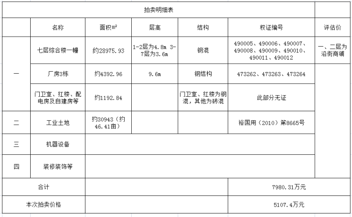一、拍賣(mài)標(biāo)的:位于六安市裕安區(qū)城南鎮(zhèn)、沿105國(guó)道、省級(jí)高新區(qū)六安高新技術(shù)產(chǎn)業(yè)開(kāi)發(fā)區(qū),六安市鴻源機(jī)械有限責(zé)任公司所擁有的房屋建筑物及附屬、土地、機(jī)器設(shè)備、裝飾裝修等,包括:1、沿105國(guó)道七層綜合樓一幢,面積約28975.93㎡,1-2層層高約4.8m ,3-7層層高約3.6m,沿105國(guó)道及其他一樓現(xiàn)作沿街門(mén)面用,二樓及以上可作服裝廠用;單層鋼構(gòu)廠房三幢,面積約4392.96㎡,層高約9.6m。以上綜合樓及廠房均有證;門(mén)衛(wèi)室、配電房及自建房等,面積約1192.84㎡,此部分無(wú)證。2、工業(yè)出讓土地30943㎡,約46.41畝,土地使用權(quán)證號(hào):裕國(guó)用(2010)第8665號(hào);3、機(jī)器設(shè)備;4、裝飾裝修等。