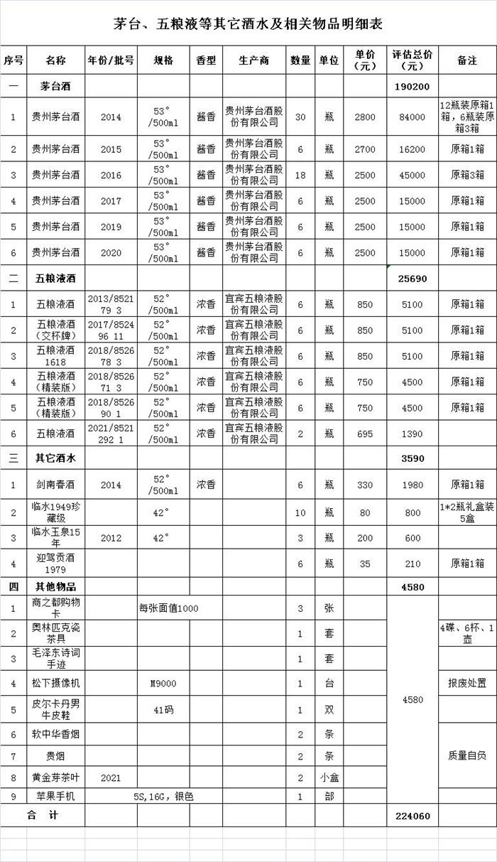 根據(jù)貴州茅臺(tái)酒股份有限公司黔茅辨(鑒)第0019083號(hào)產(chǎn)品辨認(rèn)(鑒定)表,上拍茅臺(tái)酒計(jì)72瓶;根據(jù)四川宜賓五糧液集團(tuán)有限公司川五鑒第號(hào)鑒定證明書(shū),上拍五糧液計(jì)32瓶。其他類酒水25瓶,其他類物品一批。整體打包拍賣(mài),參考價(jià):224060元,保證金:3萬(wàn)元。具體詳見(jiàn)下方清單:
