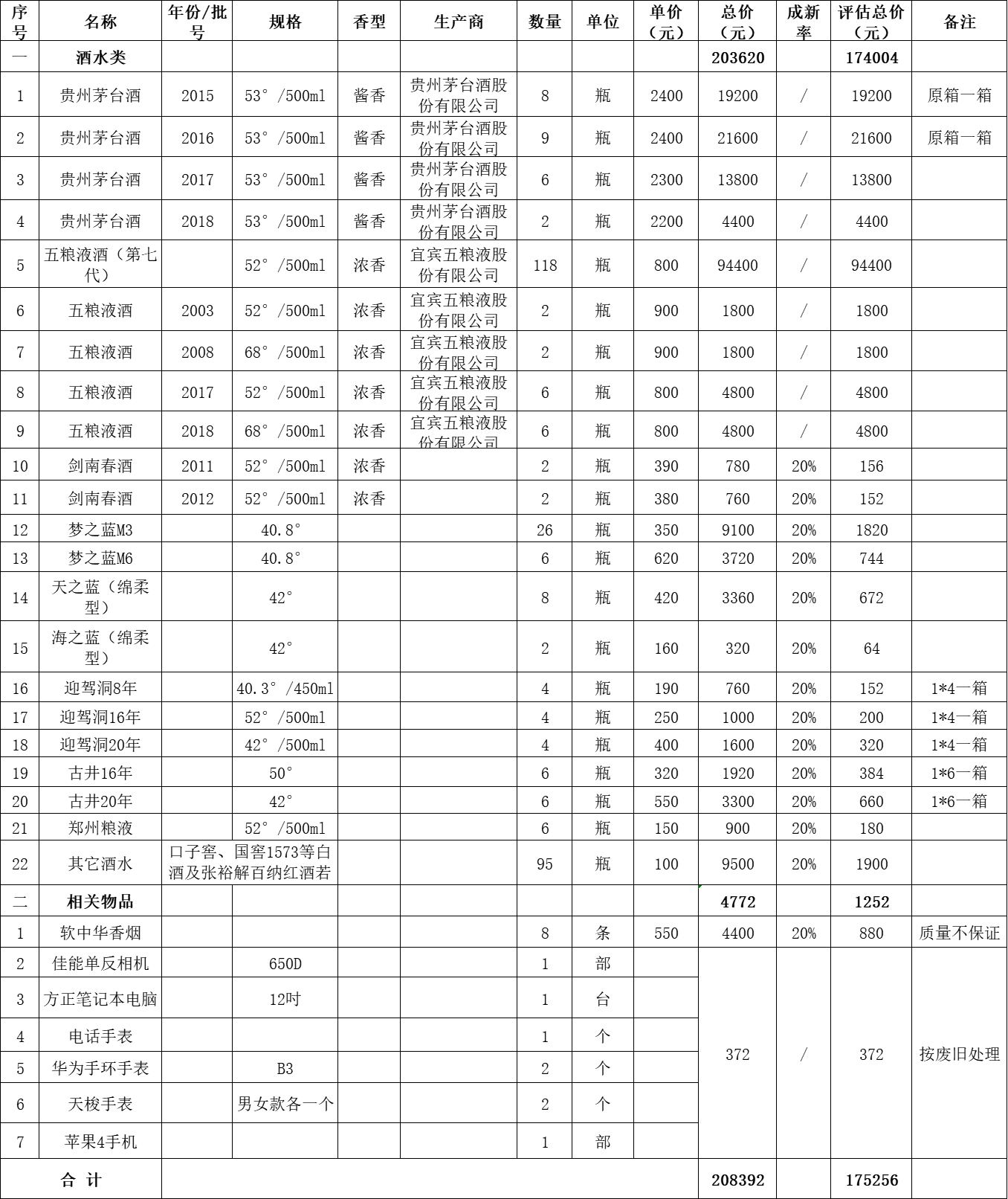 一、拍賣標的:罰沒貴州茅臺酒計25瓶、五糧液酒計134瓶、其他酒水計171瓶及其他類物品一批。整體打包拍賣,參考價:175256元,保證金:3萬元。具體詳見下方清單: