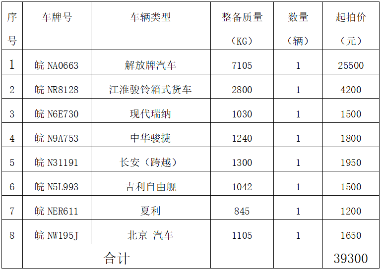 一、拍賣(mài)標(biāo)的:報(bào)廢車輛8輛,打包拍賣(mài),參考價(jià):3.93萬(wàn)元。競(jìng)拍保證金1萬(wàn)元。標(biāo)的詳情見(jiàn)下方清單: