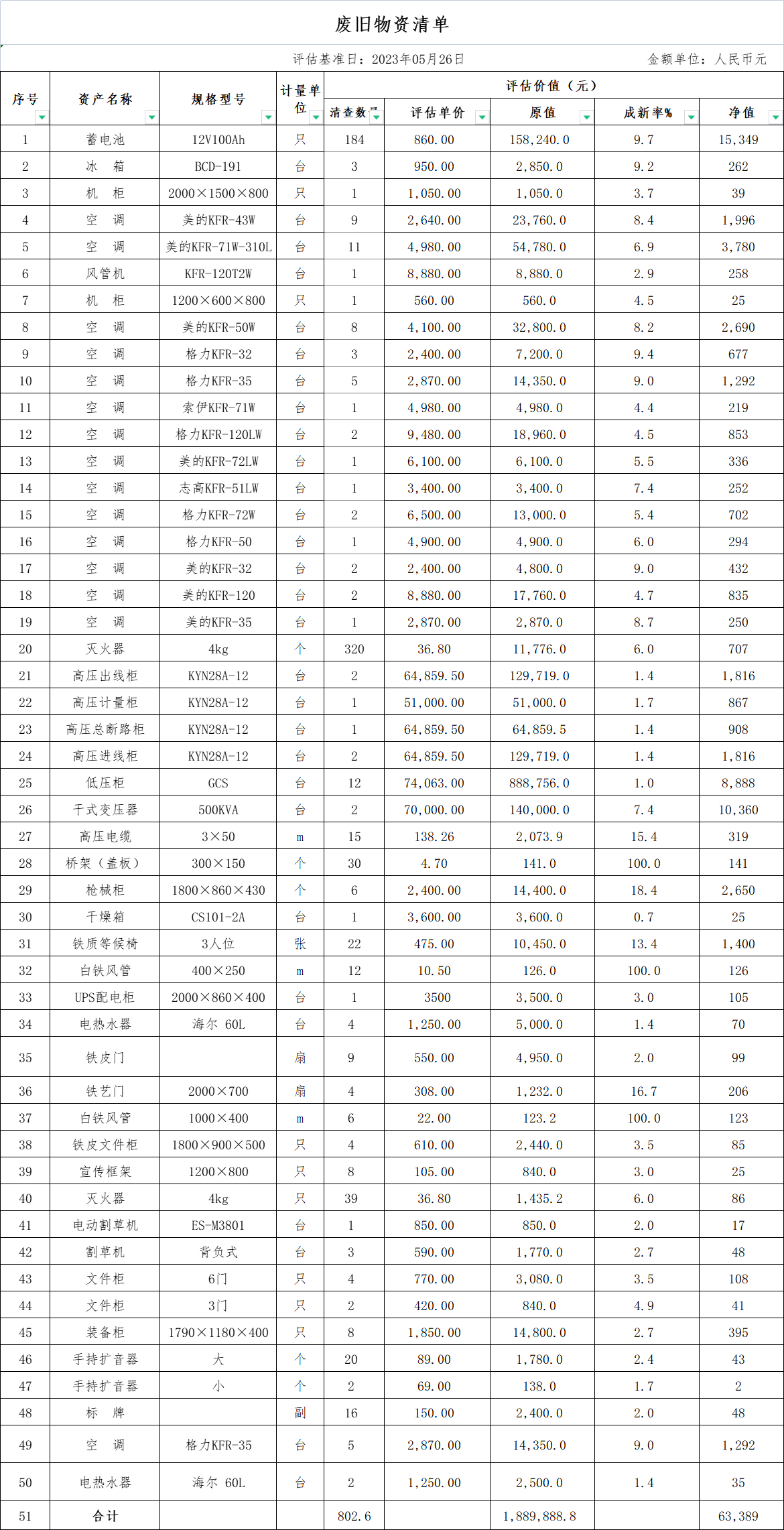 一、拍賣標的:廢舊物資一批,包括:報廢的空調、高壓出線柜、高壓計量柜、高壓總斷路柜、低壓柜、干式變壓器等,參考價:6.3389萬元。標的詳情見所附清單(清單僅供參考,若與實物不符以實物看樣為準)。