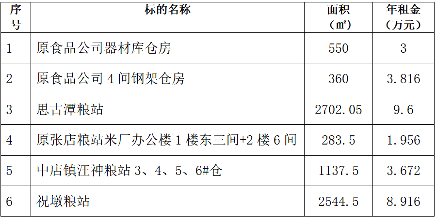 一、拍租標的:原食品公司器材庫倉房等房產(chǎn)3年期租賃經(jīng)營權,標的詳情見下表: