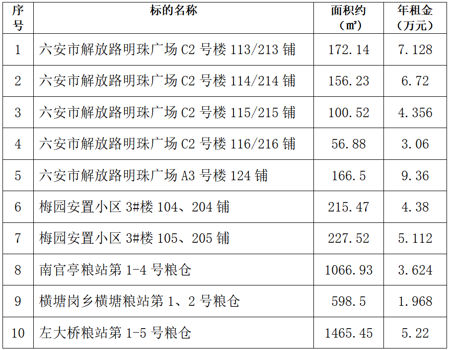 一、拍租標(biāo)的:明珠廣場、梅園小區(qū)商鋪及糧站倉庫3年期租賃經(jīng)營權(quán),標(biāo)的詳情見下表: