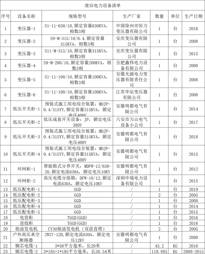 一、拍賣(mài)標(biāo)的:廢舊電力設(shè)備一批,包括:變壓器、電纜、低壓配電柜等,參考價(jià)13.96萬(wàn)元。保證金2萬(wàn)元。