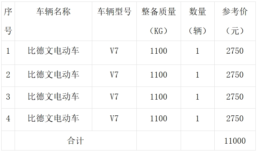 一、拍賣標(biāo)的:報廢比德文V7四輪電動車4輛,打包拍賣,參考價:11000元。競拍保證金5000元。標(biāo)的詳情見下方清單: