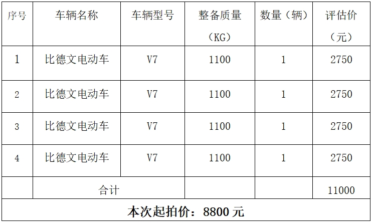 一、拍賣標的:報廢比德文V7四輪電動車4輛,打包拍賣,參考價:8800元。競拍保證金5000元。標的詳情見下方清單: