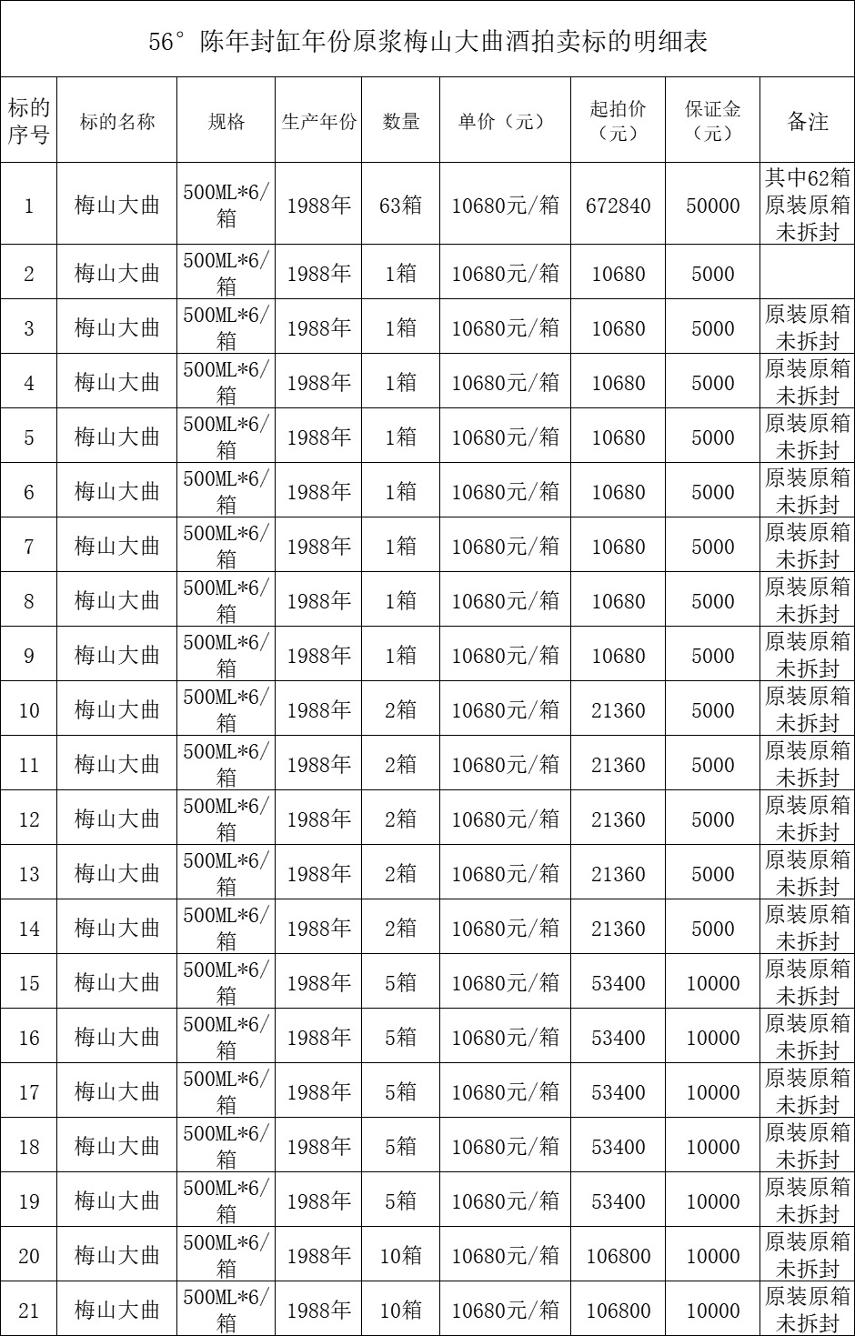 一、拍賣標(biāo)的:56°陳年封缸年份原漿老酒梅山大曲酒63箱(每箱6瓶,共計378瓶),生產(chǎn)年份:1988年(為拆封箱酒的生產(chǎn)年份),其中62箱為原裝原箱,未拆封。優(yōu)先整體拍賣,整體不成交再分別分拆成1箱、2箱、5箱、10箱拍賣。具體標(biāo)的詳情見下方清單: