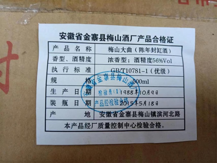 備注:1、本次拍賣標(biāo)的共計63箱,拆封一箱,顯示生產(chǎn)年份為1988年。其余推測為1988年,具體以實物為準(zhǔn),不影響成交結(jié)果。生產(chǎn)廠家:安徽省金寨縣梅山酒廠。