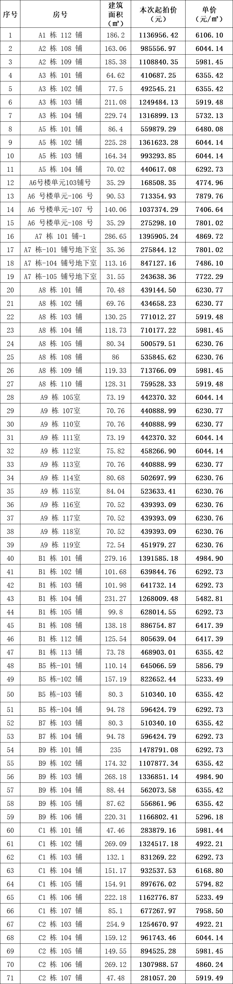 一、拍賣標(biāo)的:金寨縣金江新城沿河商鋪71間,按間拍賣,建筑面積約31.55㎡-286.65㎡/間,起拍價(jià):16.851-147.8791萬(wàn)元/間。具體每間面積、價(jià)格詳見下方所附明細(xì)表。