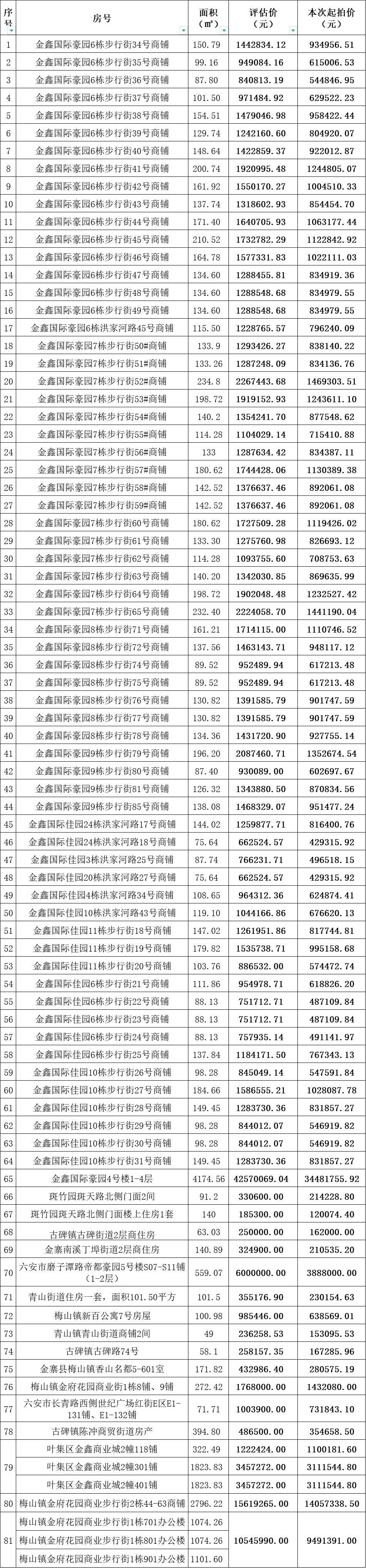 一、拍賣(mài)標(biāo)的:金寨縣金府花園、葉集金鑫商業(yè)城、金寨縣金鑫國(guó)際佳園等商鋪和房產(chǎn),商鋪面積約49㎡-4174㎡大小不等,標(biāo)的起拍價(jià)最低12萬(wàn)元起。具體每間面積、價(jià)格詳見(jiàn)下方拍賣(mài)清單。