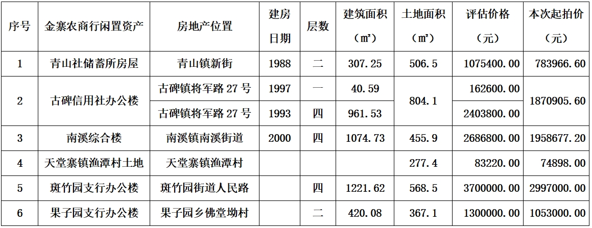 金寨農(nóng)商行房地產(chǎn):天堂寨鎮(zhèn)漁潭村土地、青山社儲(chǔ)蓄所房屋、古碑信用社(原古碑支行)辦公樓、斑竹園鎮(zhèn)瑞海國(guó)際商貿(mào)城商鋪及住宅房,房產(chǎn)面積約32㎡-1963㎡大小不等,標(biāo)的起拍價(jià)最低7.49萬元起。具體每間面積、價(jià)格詳見下方所附拍賣清單。
