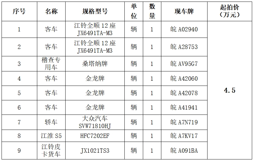 一、拍賣標(biāo)的:皖A42060金龍牌客車等9輛二手車,整體打包拍賣,參考價(jià):4.5萬(wàn)元。詳情見(jiàn)下表: