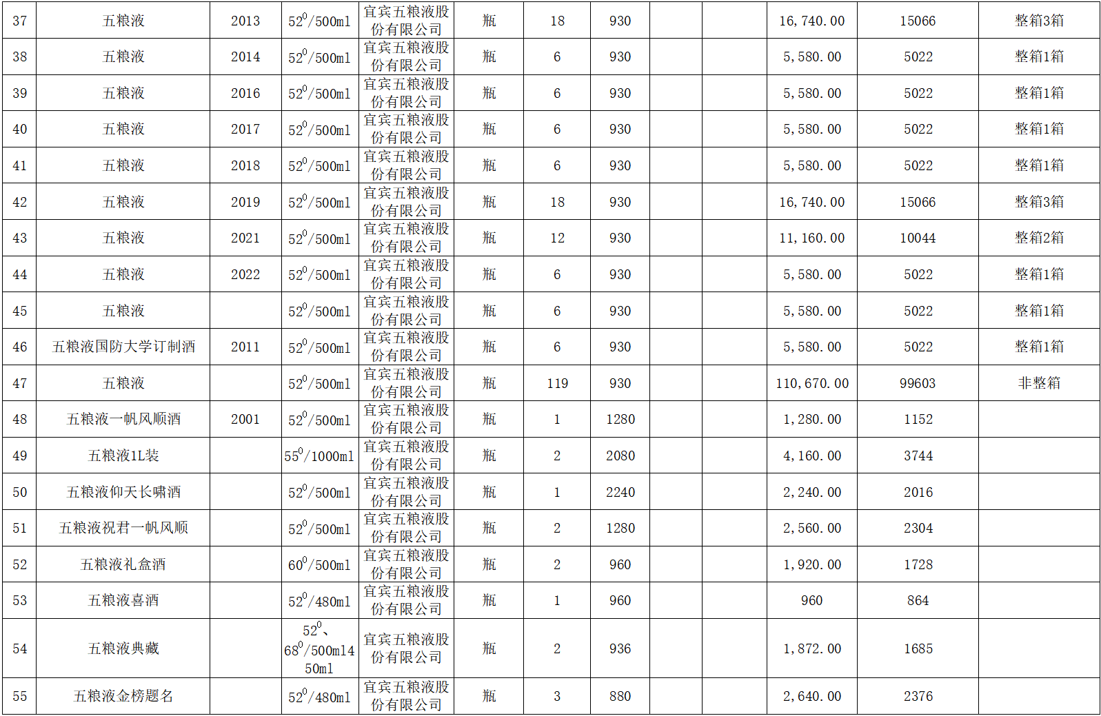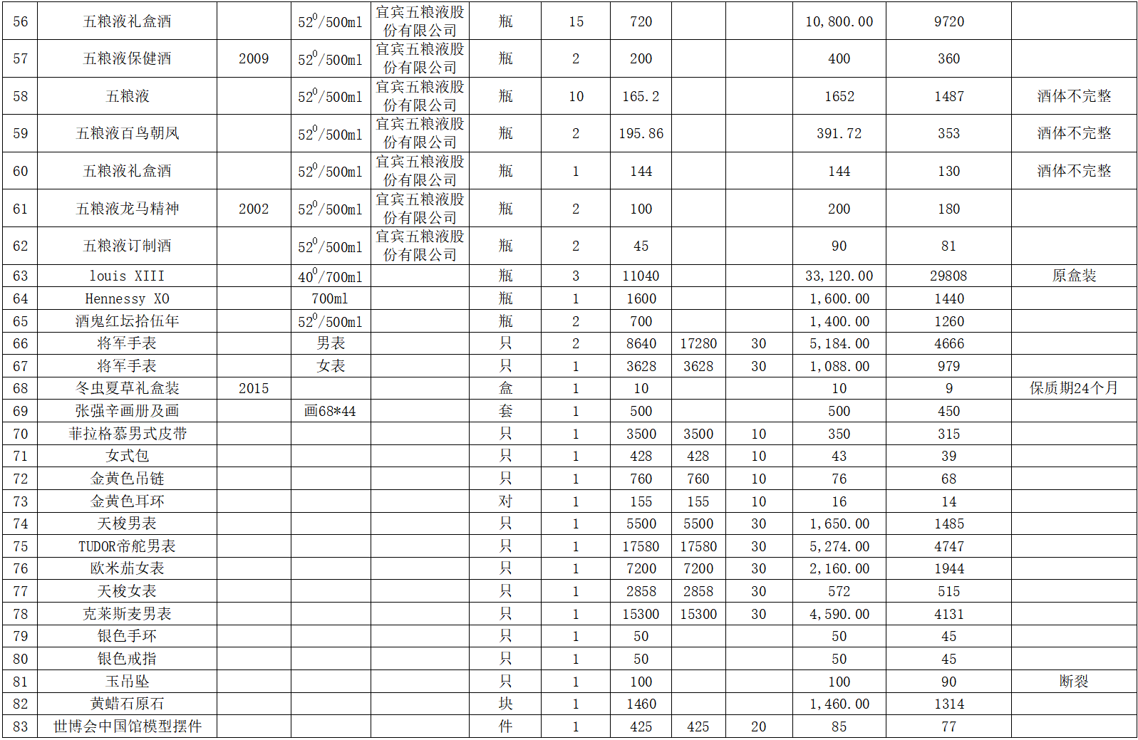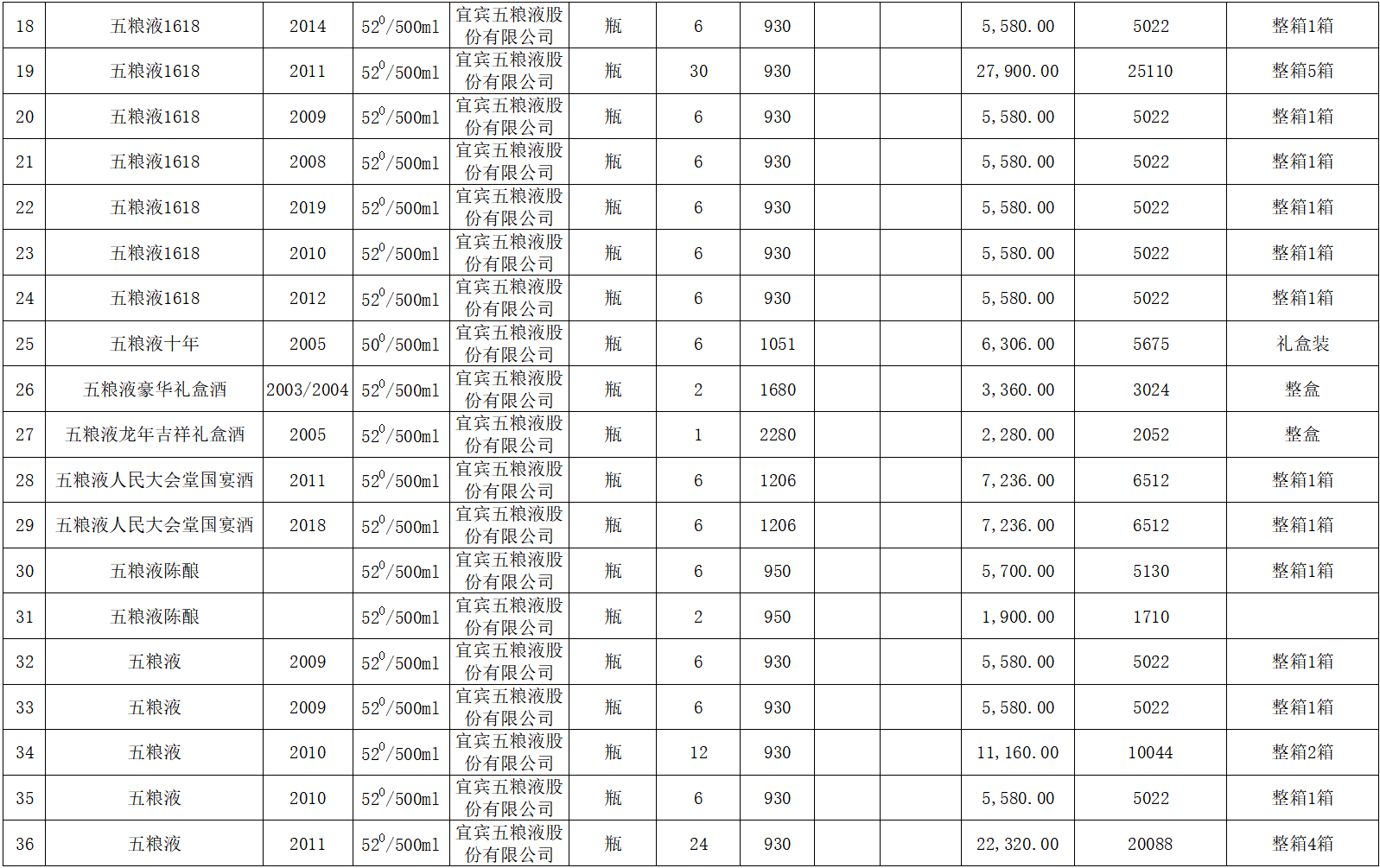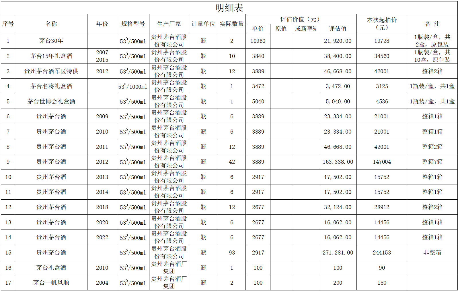 一、拍賣標(biāo)的:貴州茅臺(tái)酒計(jì)224瓶、五糧液酒計(jì)406瓶及其他酒水、物品一批,整體打包拍賣,參考價(jià):106.047萬元。競(jìng)買保證金:10萬元。詳見下方明細(xì)表: