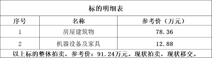 以上標(biāo)的整體拍賣(mài),參考價(jià):91.24萬(wàn)元。現(xiàn)狀拍賣(mài),現(xiàn)狀移交。保證金:10萬(wàn)元。標(biāo)的詳情見(jiàn)中拍平臺(tái)附件《標(biāo)的明細(xì)表》。