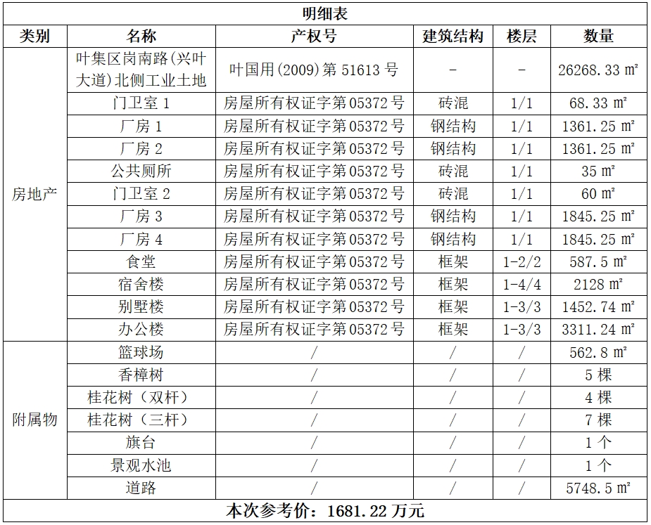 一、拍賣標的:六安市葉集試驗區(qū)崗南北側路(興葉大道北側)原綠源工藝品廠工業(yè)房地產及附屬物,房屋建筑面積約14055.81㎡,土地面積約26268.33㎡。參考價:1681.22萬元。保證金:168萬元。