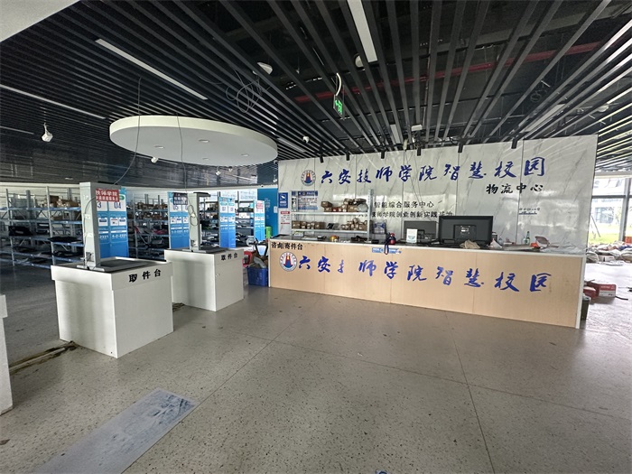 安徽六安技師學(xué)院佛子嶺路校區(qū)商貿(mào)樓物流實訓(xùn)室一樓快遞驛站↑