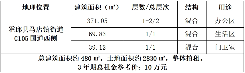 一、拍租標(biāo)的:位于霍邱縣馬店鎮(zhèn)街道G105國(guó)道西側(cè)的霍邱縣公安局交通管理大隊(duì)馬店中隊(duì)辦公用房3年期租賃權(quán),3年期總租金參考價(jià):10萬(wàn)元,成交后,競(jìng)得人與委托方簽訂3年期房屋租賃合同。標(biāo)的詳情見(jiàn)下表:
