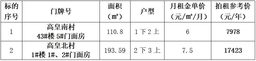 一、拍租標(biāo)的:六安市裕安區(qū)平橋工業(yè)園高皇南、北村部分門面房3年期租賃經(jīng)營權(quán),標(biāo)的詳情見下表: