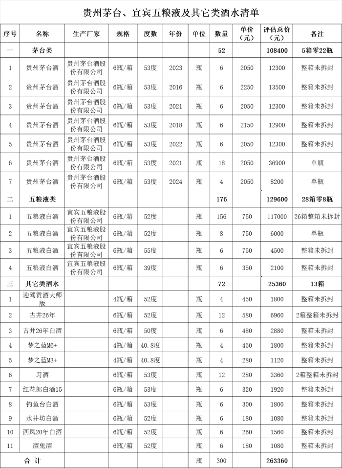 一、拍賣標的:茅臺酒計52瓶、五糧液計176瓶及其它類酒水計72瓶,整體打包拍賣,參考價:26.336萬元,競買保證金:2萬元。標的詳見下方清單:
