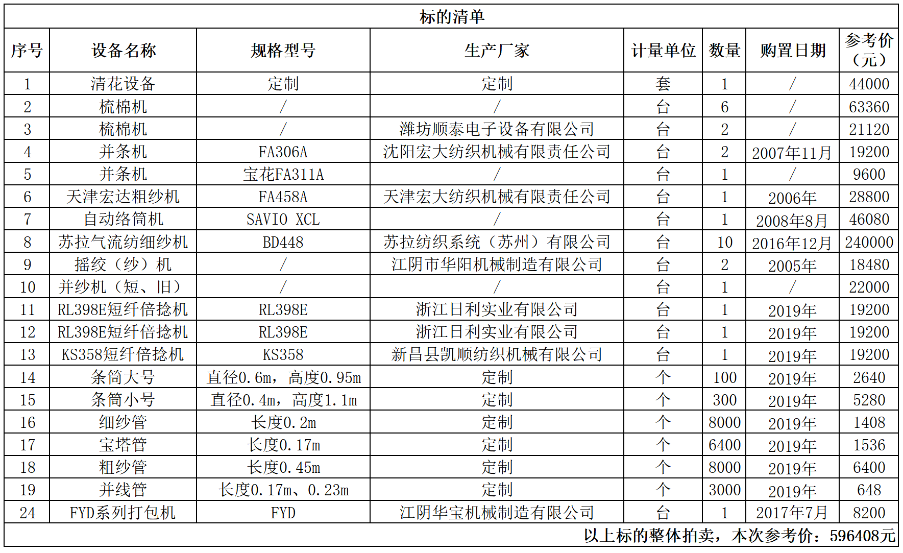 一、拍賣(mài)標(biāo)的:二手紡織設(shè)備一批,包括清花設(shè)備、自動(dòng)絡(luò)筒機(jī)、梳棉機(jī)、并條機(jī)、粗紗機(jī)、細(xì)紗機(jī)等。以上標(biāo)的整體拍賣(mài),參考價(jià):59.6408萬(wàn)元。現(xiàn)狀拍賣(mài),現(xiàn)狀移交。競(jìng)買(mǎi)保證金:10萬(wàn)元。