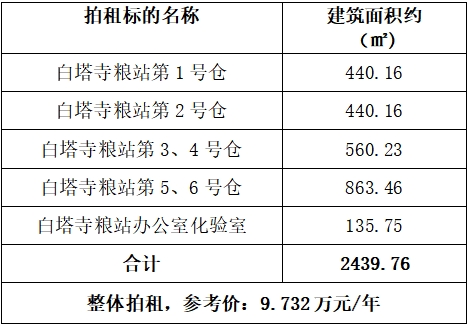 一、拍租標(biāo)的:六安市金安區(qū)白塔寺糧站第1-6號倉及辦公室化驗(yàn)室3年期租賃經(jīng)營權(quán),整體拍租,建筑面積約:2439.76 ㎡,參考價(jià):9.732萬元/年。標(biāo)的詳情見下表: