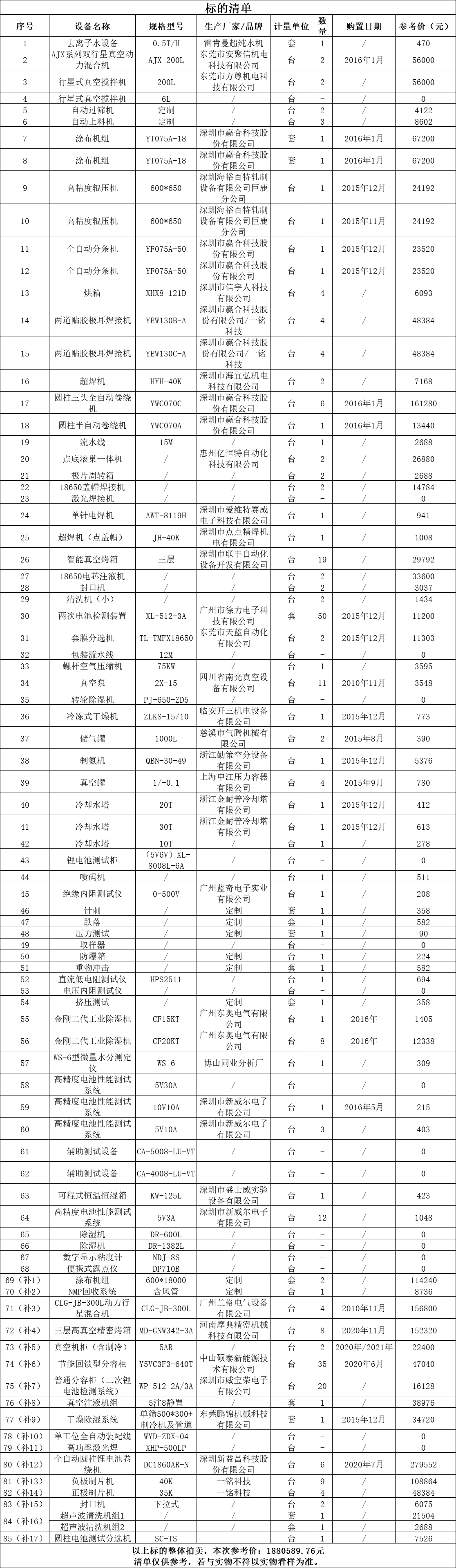 一、拍賣標(biāo)的:全自動(dòng)圓柱鋰電池卷繞機(jī)、正負(fù)制片機(jī)、AJX系列雙行星真空動(dòng)力混合機(jī)、圓柱三頭全自動(dòng)卷繞機(jī)、行星式真空攪拌機(jī)、涂布機(jī)組等二手設(shè)備一批,整體拍賣,參考價(jià):1880589.76元。競買保證金:20萬元。