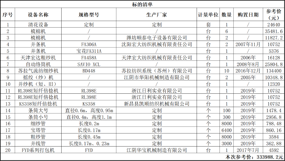 一、拍賣標(biāo)的:二手紡織設(shè)備一批,包括清花設(shè)備、自動絡(luò)筒機(jī)、梳棉機(jī)、并條機(jī)、粗紗機(jī)、細(xì)紗機(jī)等。以上標(biāo)的整體拍賣,參考價(jià):333988.2元。現(xiàn)狀拍賣,現(xiàn)狀移交。競買保證金:5萬元。
