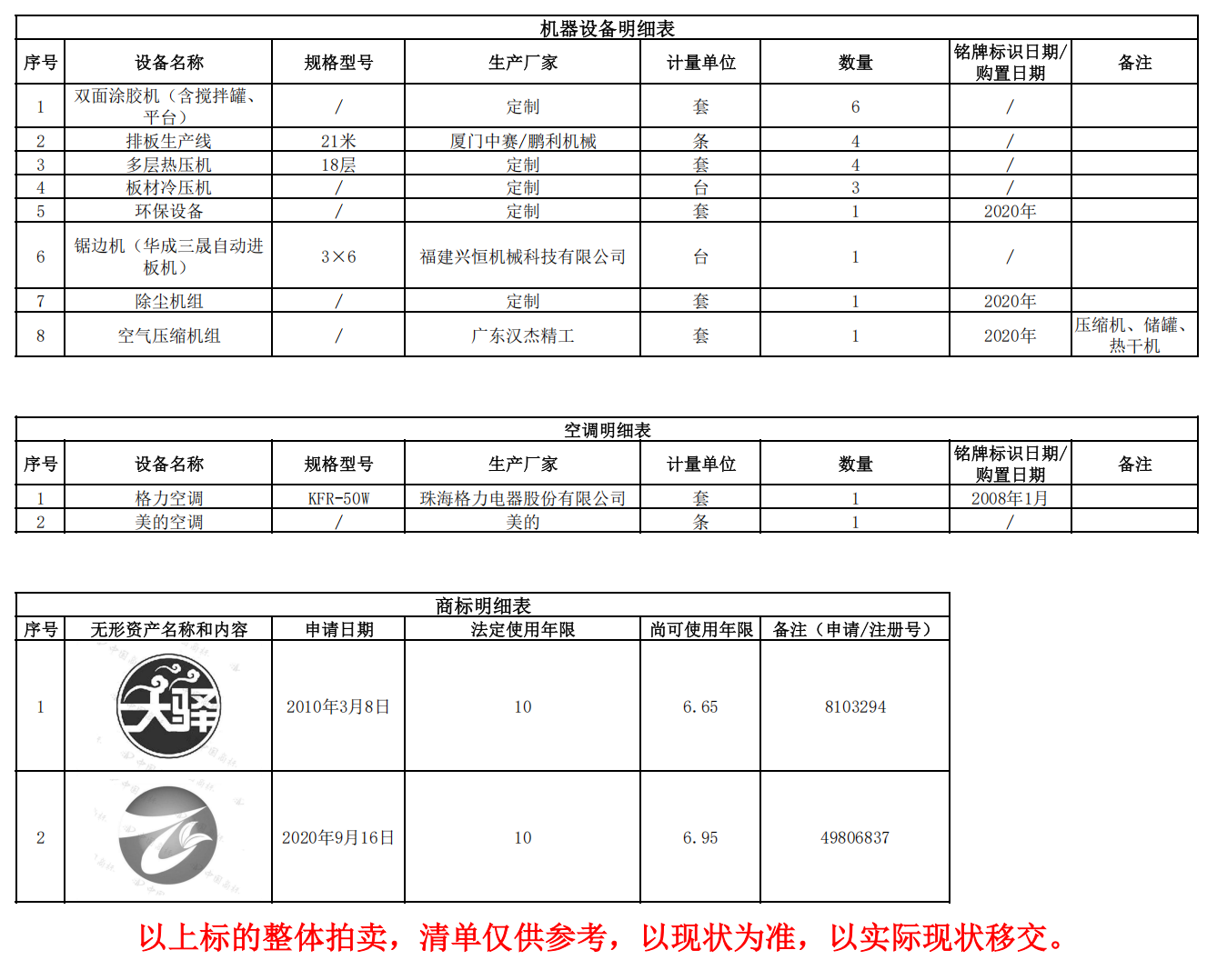 一、拍賣(mài)標(biāo)的:六安市葉集區(qū)天億木業(yè)有限責(zé)任公司位于葉集綠色板材工業(yè)園的機(jī)器設(shè)備一批、空調(diào)兩臺(tái)、商標(biāo)兩項(xiàng),參考價(jià):26.195萬(wàn)元。標(biāo)的物以現(xiàn)狀為準(zhǔn),以實(shí)際現(xiàn)狀移交。標(biāo)的明細(xì)見(jiàn)下方: