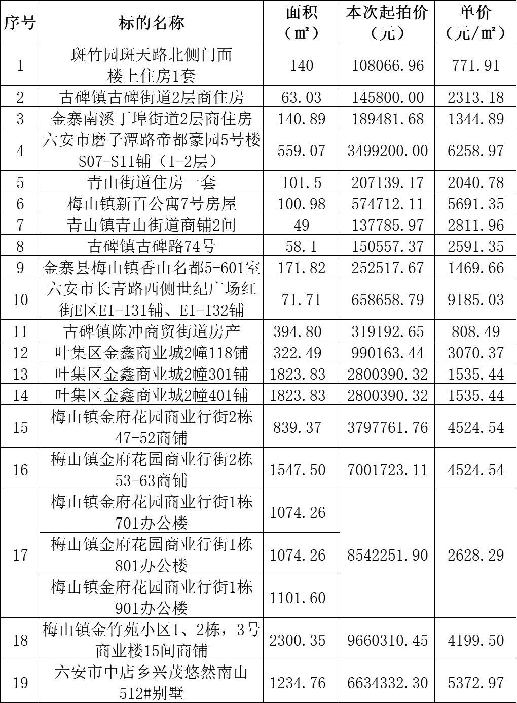 六安市磨子潭路帝都豪園商鋪、古碑鎮(zhèn)古碑街道商住房、葉集區(qū)金鑫商業(yè)城商鋪、梅山鎮(zhèn)金府花園商業(yè)行街辦公樓、六安興茂悠然南山別墅等19處房產(chǎn),最低單價771.91元/㎡。標的詳情見下方所附清單: